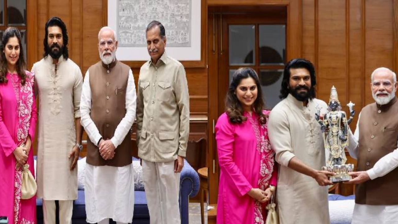 പ്രധാനമന്ത്രി നരേന്ദ്ര മോദിക്ക് വില്ല് സമർപ്പിച്ച് രാം ചരൺ